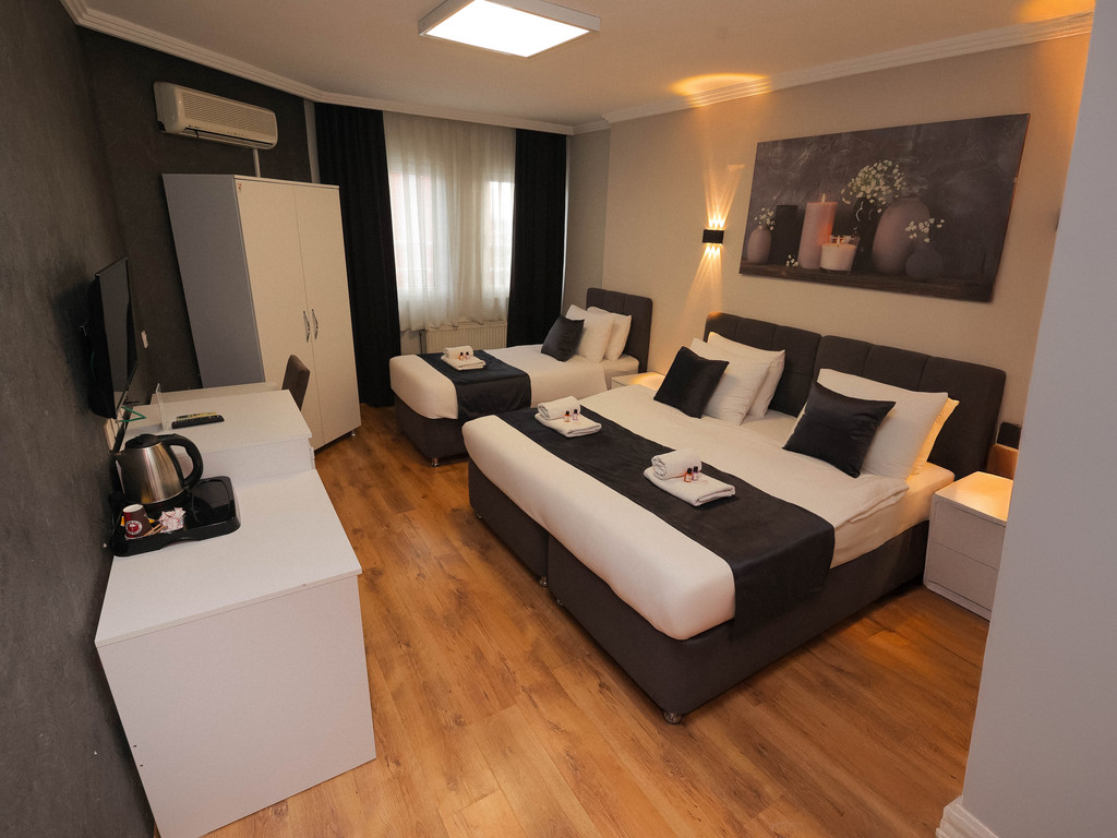 Üç kişilik Aile Odamızda Bir Adet King Double Yatak , Bir Adet Tek Kişilik Yatak, Klima, Mini Buzdolabı (0,5 ml 2 adet su ücretsiz), Su Isıtıcı (2 Adet Sallama Çay ücretsiz ), Led 32 inç Uydu TV, Oda Telefonu, Buklet Şampuan, Duş Jeli, Terlik, Sabun , Otel Tipi Dikiş Seti , Saç Kurutma Makinası bulunmaktadır.