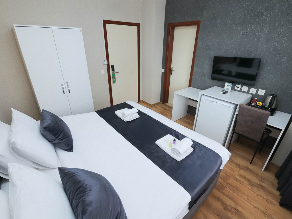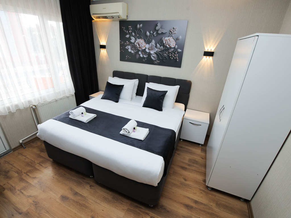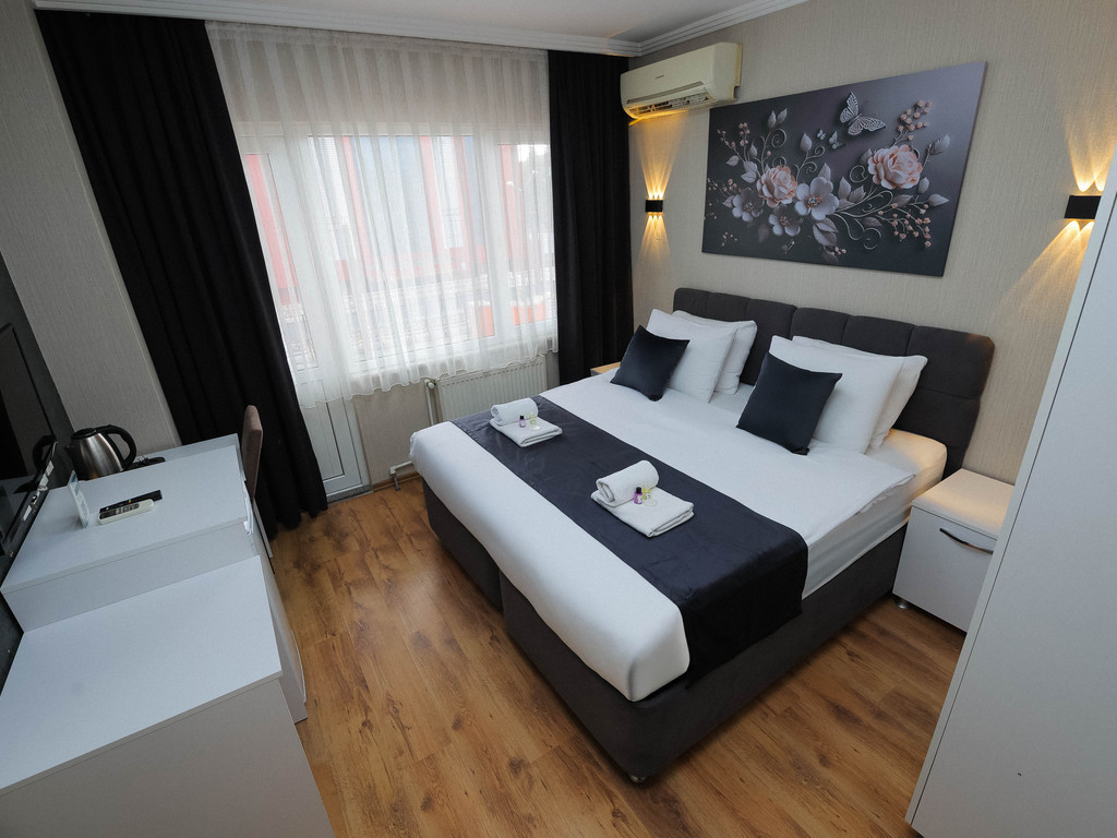 Rezervasyon YapÇift Kişilik Odamızda Bir Adet King Double Yatak, Klima, Mini Buzdolabı (0,5 ml 2 adet su ücretsiz), Su Isıtıcı (2 Adet Sallama Çay ücretsiz ), Led 32 inç Uydu TV, Oda Telefonu, Buklet Şampuan, Duş Jeli, Terlik, Sabun , Otel Tipi Dikiş Seti , Saç Kurutma Makinası bulunmaktadır.